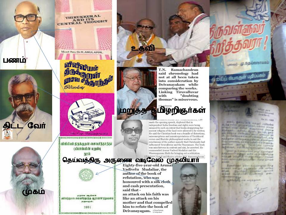 சாந்தோம் சர்ச் பணத்தில் - திருவள்ளுவர் கிறிஸ்துவரா என முதல் நூல் ஆரம்பித்து, பின் பல வெளியிட்டு, சாந்தோம் சர்ச் 100% பணத்தில் தமிழ் கிறிஸ்துவத் துறை அமைத்து தோமோவின் போதனையில் திருக்குறள், சைவம்- வைணவம் என அனைத்தும் எழுந்ததாக முனைவர் பட்டங்கள் வாரி வழங்கப்படுகிறது.